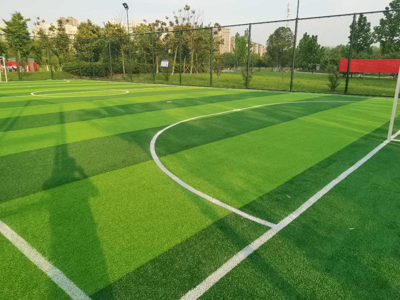 此外,人造草系統(tǒng)的多孔背襯有足夠多的孔隙滿足天然草根系下扎生長(zhǎng)的空間,多孔背襯也保護(hù)了下面的根系不被踐踏損傷。同時(shí),天然草根莖被有效保護(hù)在人造草系統(tǒng)里,得以良好生長(zhǎng)。這種混合草系統(tǒng)使用壽命可達(dá)到常規(guī)天然草坪的3倍以上。