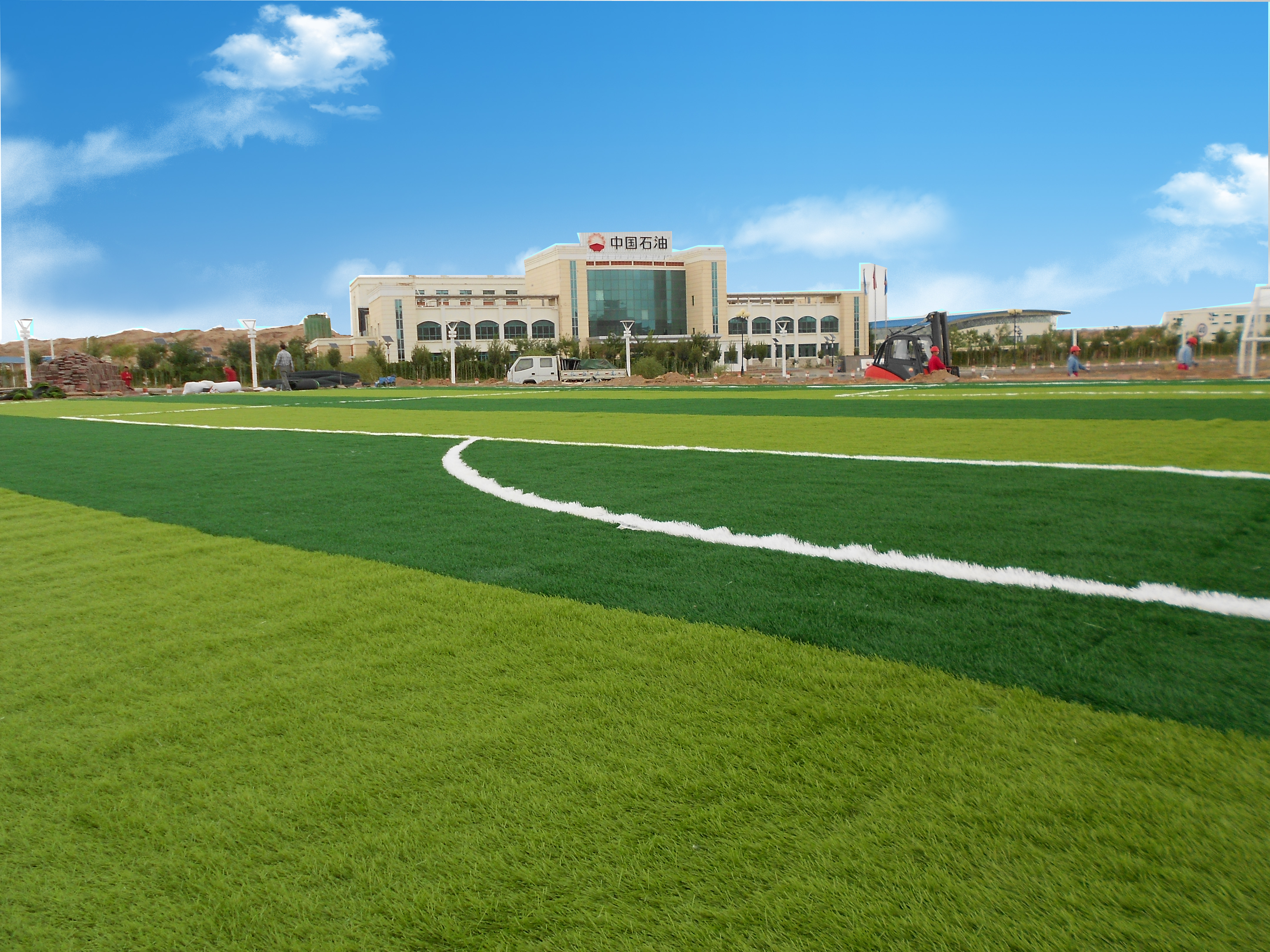 足球場人造草坪運輸?shù)綀龅厍暗?-2天,先用水沖洗一下場地,場地完全晾干后,注意:一定要檢查場地是否存在積水的情況、同時對不平整的區(qū)域進行修正、填補;待鋪設基礎達標、符合足球場人造草坪的鋪裝要求后,安排物流將人造草坪運送到場地。人造草坪送到場地后,根據(jù)設計圖紙復合場地的尺寸、找準基點并將場地的四周界線打好。注意,應將場地上的雜物再次清理干凈。接下來,按照球場的設計圖紙開始放草(也叫草坪放樣)。