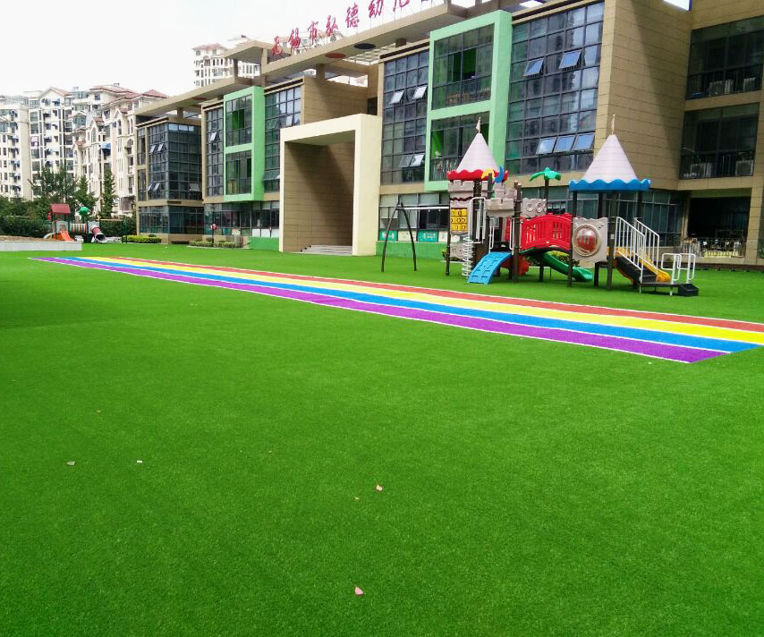 (6)、將20厘米寬的連接帶沿草皮接縫處鋪開,放入草皮下面,盡量使草皮的接縫位于連接帶的中央(如果雨水打濕,需晾曬半天使之干燥),然后將膠水用橡皮刮板均勻地涂刮在連接帶上,再把兩邊的草皮拼合,膠粘于連接帶上,如果拉直后拼合處縫隙較大,可在此處隔2-5厘米割開一道,向接口處拉伸,以確保外形美觀。