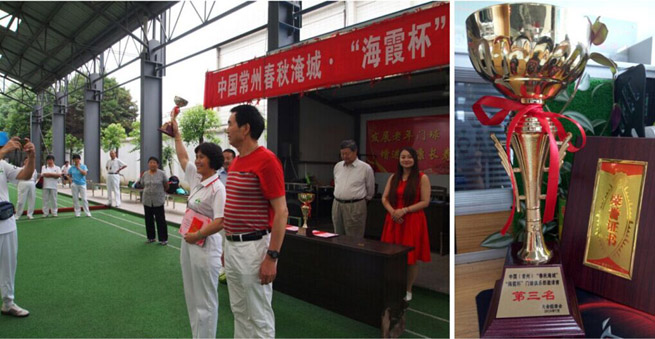 2015常州春秋淹城•“海霞杯”全國門球俱樂部邀請賽于7月5日正式落幕。經(jīng)過數(shù)天的激烈角逐后,無錫格林人造草坪的格林草坪代表隊終斬獲佳績,獲得2015中國(常州)春秋.淹城“海霞杯”門球俱樂部邀請賽季軍的傲人佳績。近日,榮耀歸來的格林草坪門球隊的隊員們,齊聚無錫市格林人造草坪有限公司總部,參加了慶功宴,并且交流分享了比賽獲獎經(jīng)驗。為了更好地支持,并且鼓勵隊員們在今后的比賽中再獲佳績,公司特意給此次比賽的每位隊員頒發(fā)了獎金。格林草坪隊的老師們還來到格林草坪工廠與公司參加交流,老師們參觀工廠,知道人造草坪的制造過程,實地看見大規(guī)模的生產(chǎn)線后,對格林人造草坪更增加了更深厚的信心。