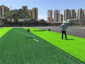 人造草坪施工計劃 人造草坪施工流程簡單概括為六個過程。 施工流程如下:測畫底線草卷展開、修邊粘接綠草(幅間)接縫確定白線···